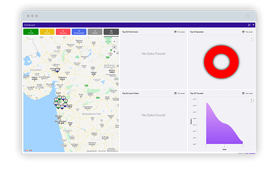 The leftside of the dashboard shows live tracking screen for tracking your employees. Above this you will see the employee status which includes employees on duty, off duty, on leave, inactive and whose current data are not available.
