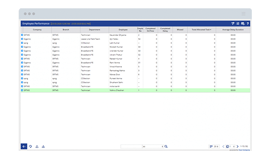 • Employee Performance – Report regarding the tasks completed on task, task delayed, and tasks missed.